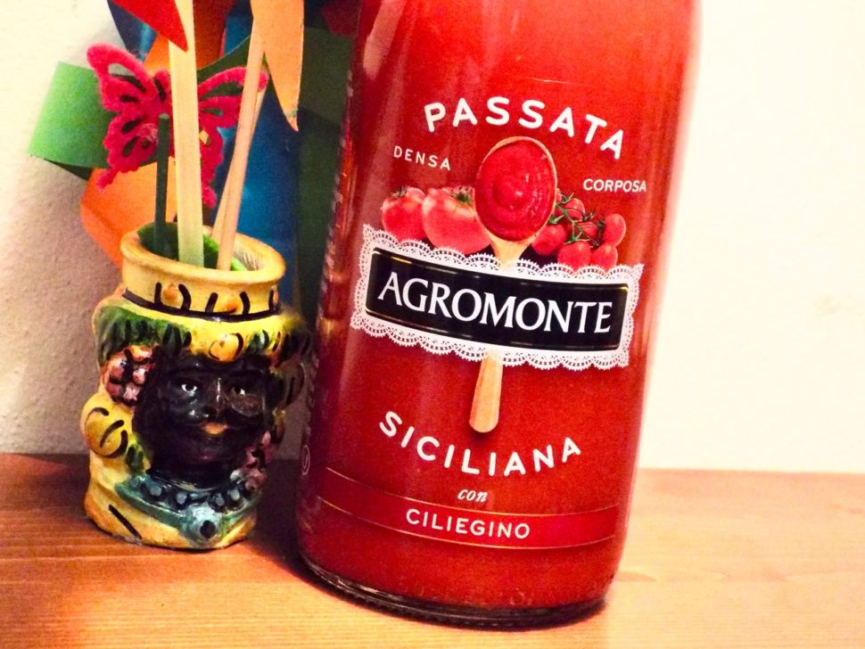 Пюре из сицилийских томатов и помидоров черри Agromonte, содержит: томат (68,6%), помидор черри (29,4%) и соль.
